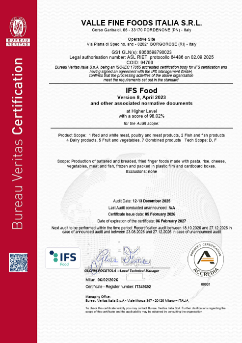Valle Fine Foods is proud to be certified by Bureau Veritas Italia S.p.A. under the IFS Broker standard, ensuring our commitment to the highest quality and safety standards in the food industry.